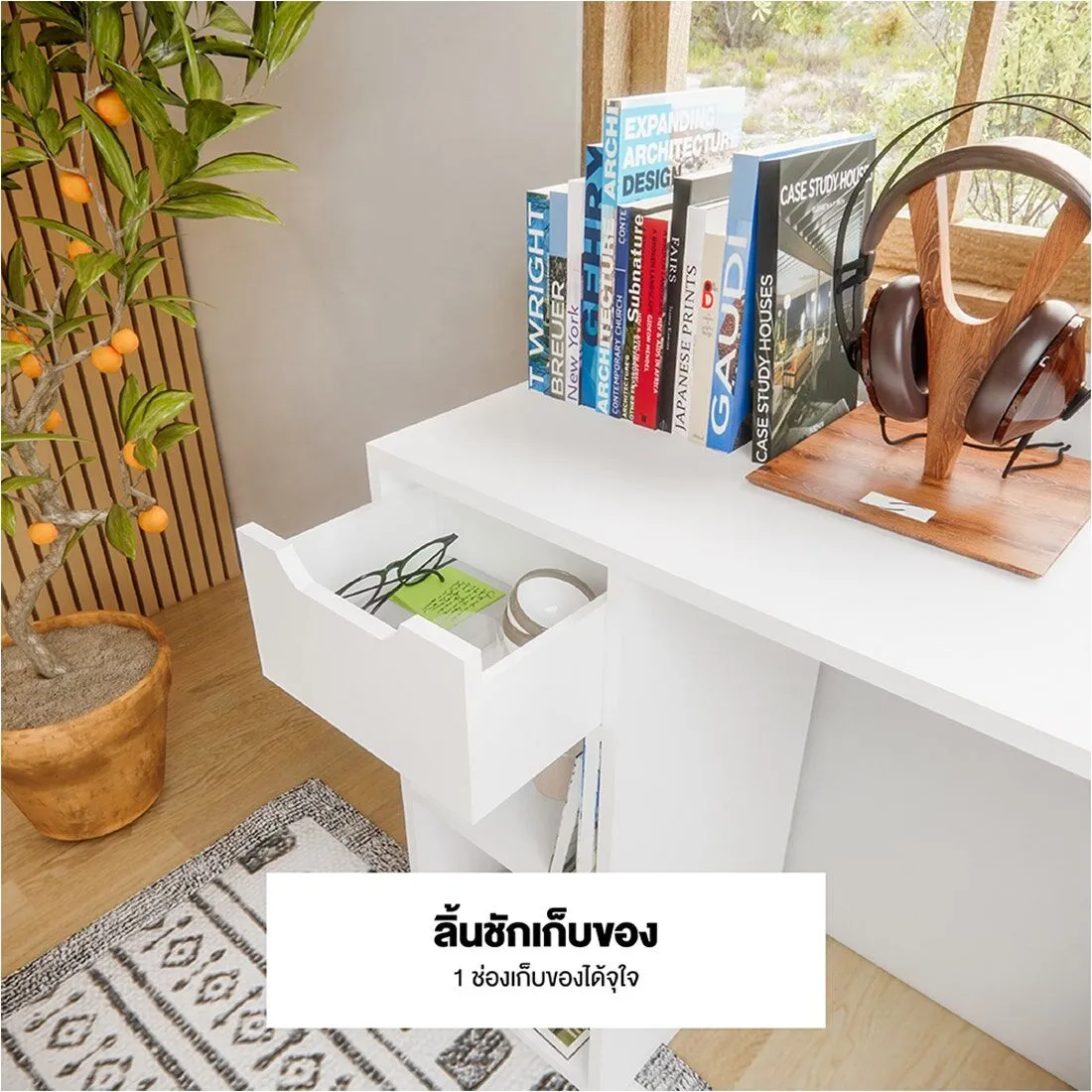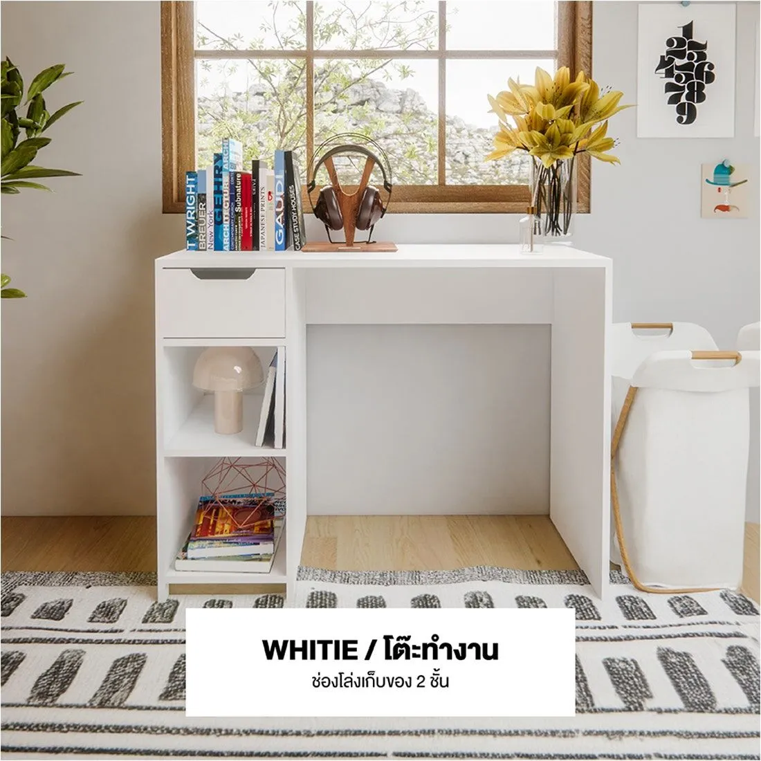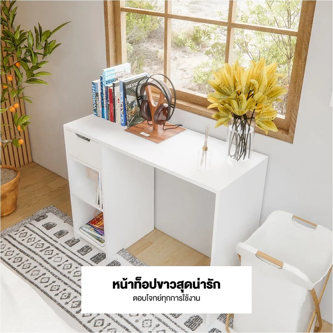 โต๊ะทำงาน KC-PLAY รุ่น WHITIE สีขาว-ลินเบิร์ก สร้างสรรค์งานในบ้านสำหรับคนรุ่นใหม่ โต๊ะทำงานสีขาว สไตล์มินิมอล 1 ลิ้นชัก และช่องโล่งเก็บของ 2 ชั้น ขนาดเล็ก ฟังก์ชั่นเยอะ เหมาะกับการวางในห้องคอนโด ***สินค้าต้องประกอบเองก่อนใช้งาน สแกนคู่มือประกอบสินค้ารูปแบบ QR Code ได้ที่ข้างกล่อง (หมายเหตุ ราคาสินค้าไม่รวมค่าประกอบและจัดส่ง)***