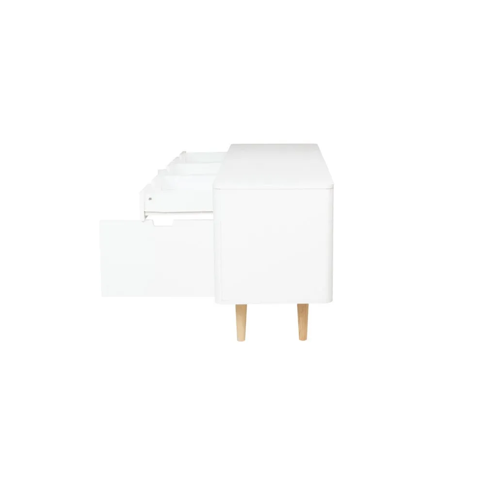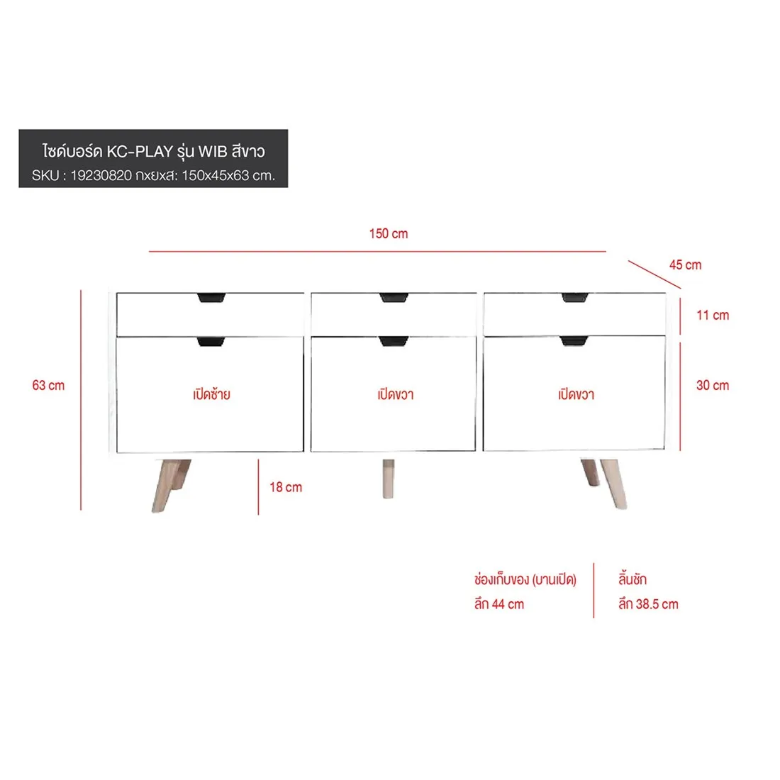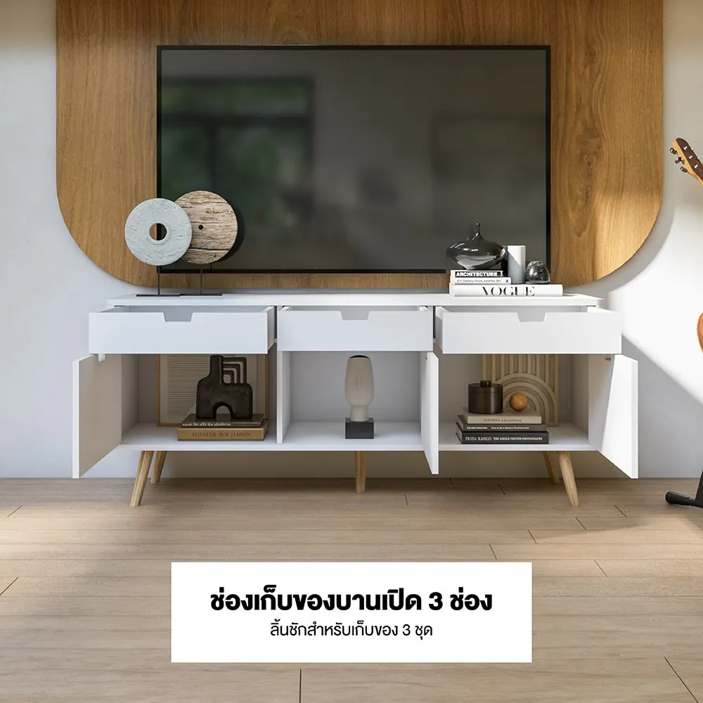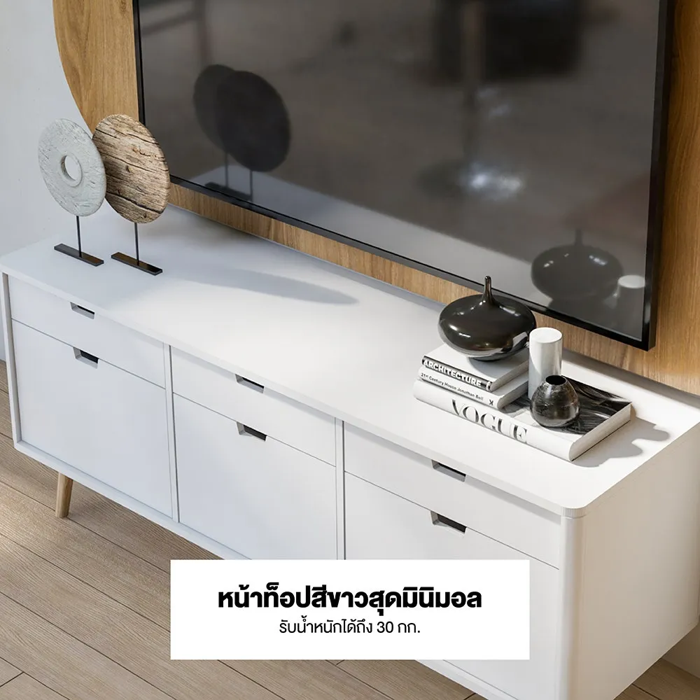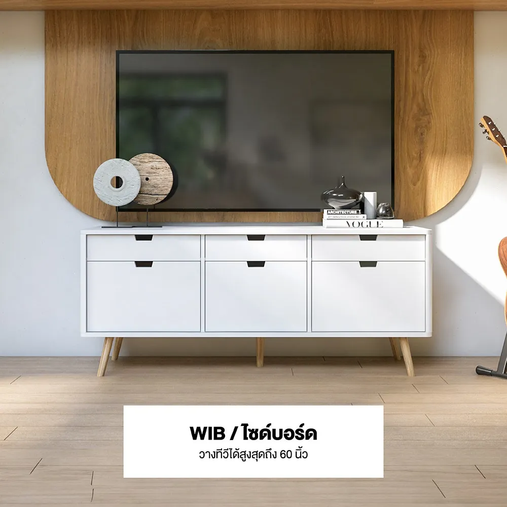 ไซด์บอร์ด KC-PLAY รุ่น WIB สีขาว รองรับทีวีสูงสุด 60 นิ้ว โครงสร้างขาไม้ยางทำสี มีชุดลิ้นชักสำหรับเก็บของ 3 ชุด รับน้ำหนัก 3 กก. ต่อชุด และช่องเก็บของ พร้อมบานเปิดขนาดใหญ่พิเศษ 3 ช่อง หน้าโต๊ะ รับน้ำหนักได้ 30 กก.