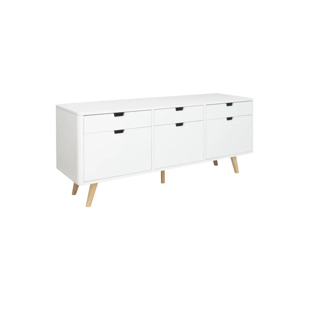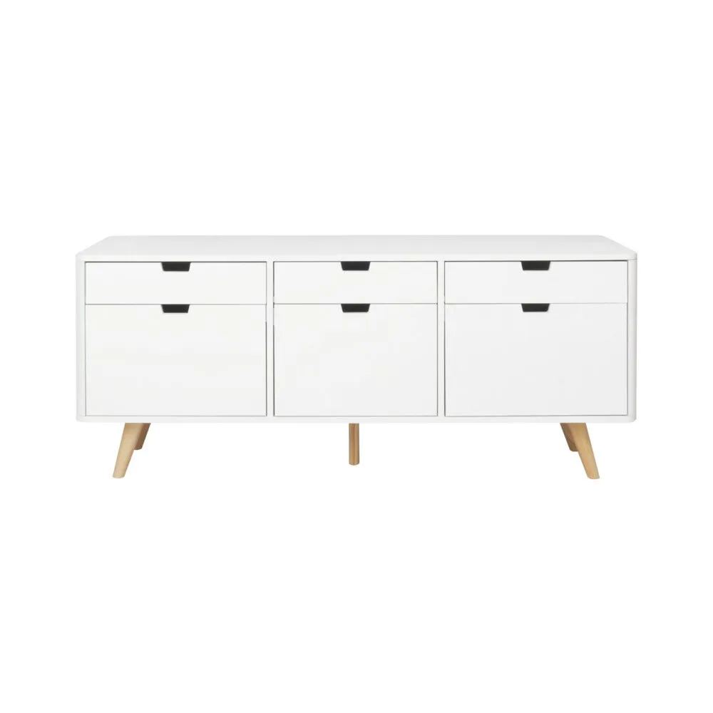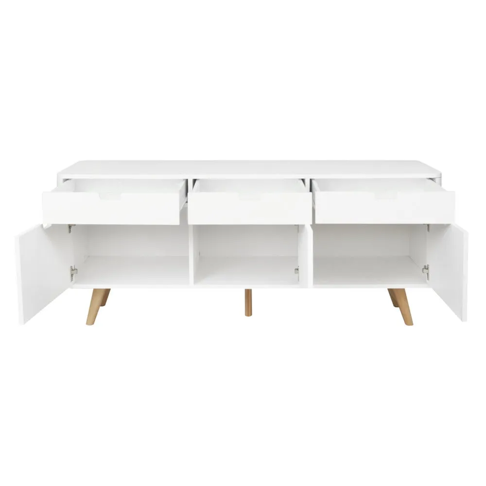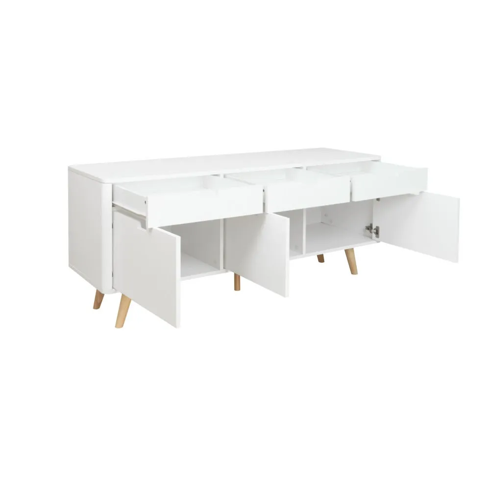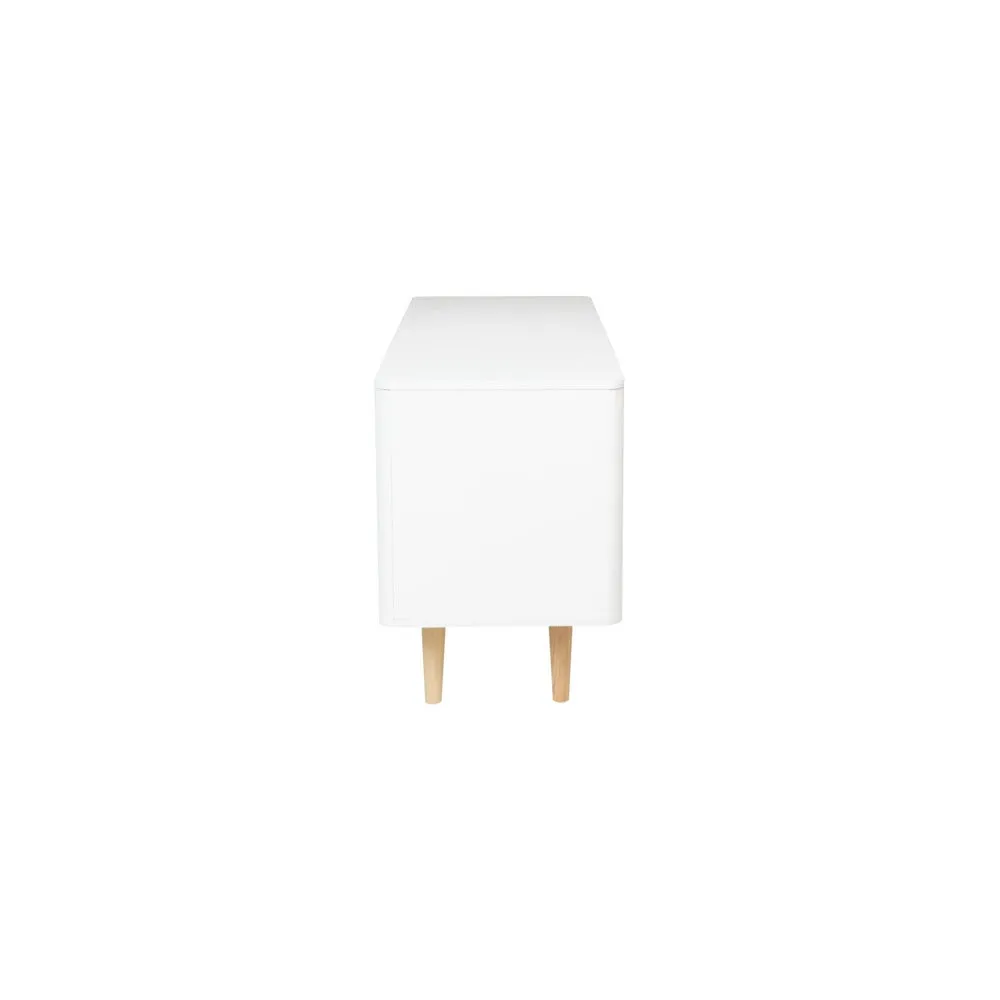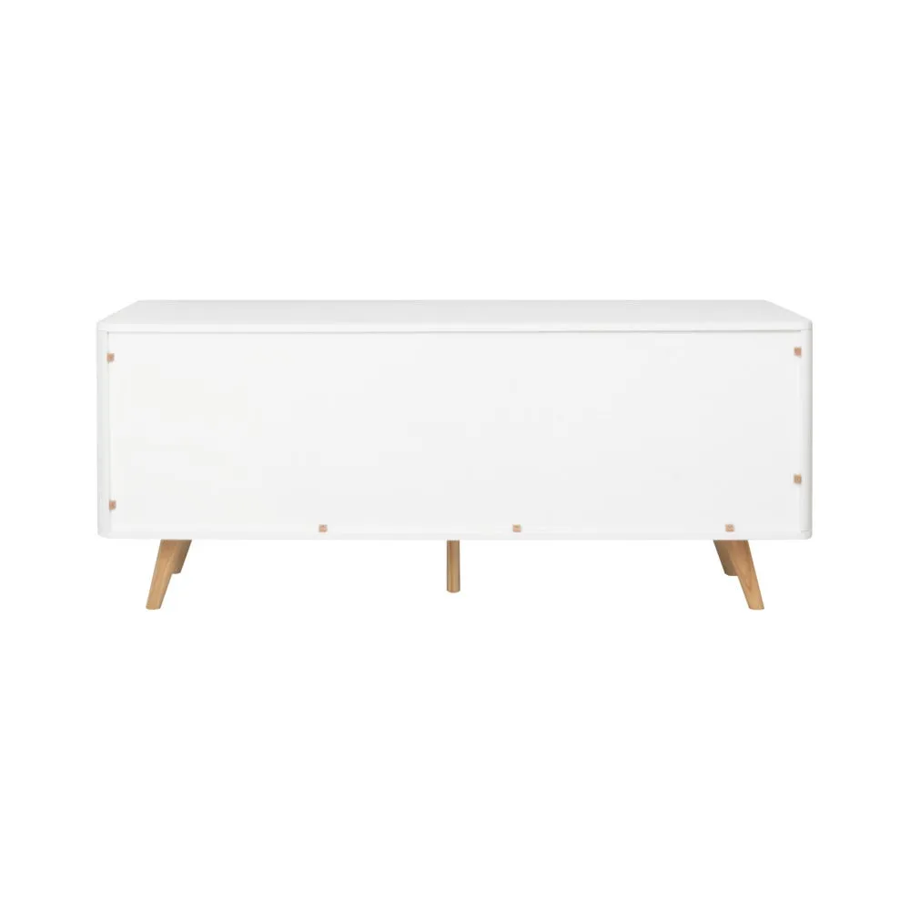 ไซด์บอร์ด KC-PLAY รุ่น WIB สีขาว รองรับทีวีสูงสุด 60 นิ้ว โครงสร้างขาไม้ยางทำสี มีชุดลิ้นชักสำหรับเก็บของ 3 ชุด รับน้ำหนัก 3 กก. ต่อชุด และช่องเก็บของ พร้อมบานเปิดขนาดใหญ่พิเศษ 3 ช่อง หน้าโต๊ะ รับน้ำหนักได้ 30 กก.